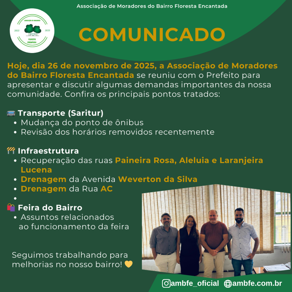 Hoje, dia 26 de novembro de 2025, a Associação de Moradores do Bairro Floresta Encantada se reuniu com o Prefeito para apresentar e discutir algumas demandas importantes da nossa comunidade. Confira os principais pontos tratados: